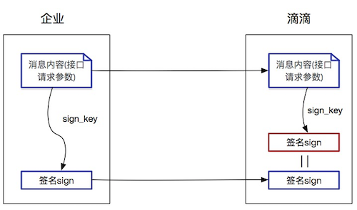 通过数字签名就可以解决上述的问题。具体为:约定sign_key作为密钥,该sign_key仅贵企业和滴滴知道,在传输中不可见,用于参与签名计算。 企业在发送请求前,将消息内容与sign_key按照滴滴提供的签名算法计算出签名。滴滴在收到请求时,也按相同算法计算出签名。 如果为同一签名,则可信任来源为贵企业,并且内容是完整的。
